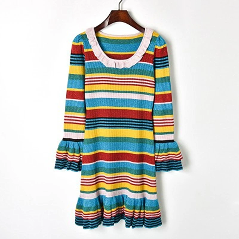 Cheap 2018 New Contrast Color Striped Gold Lace Ruffled Knit Skirt Knit Ruffled Sleeve Dress Round Neck F