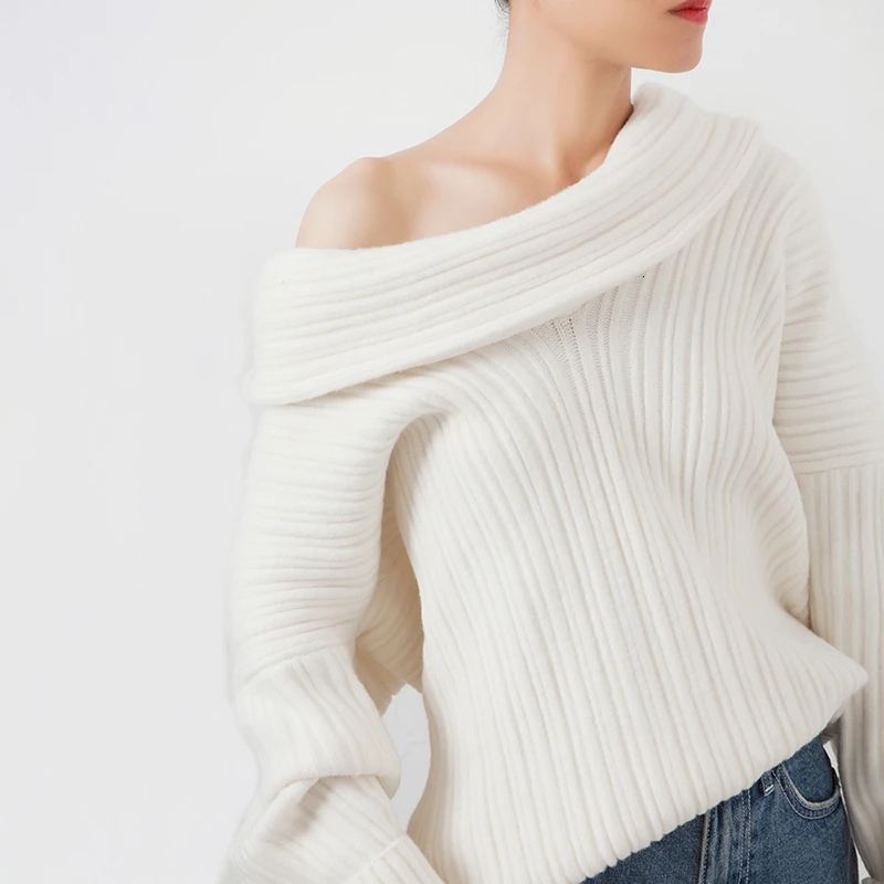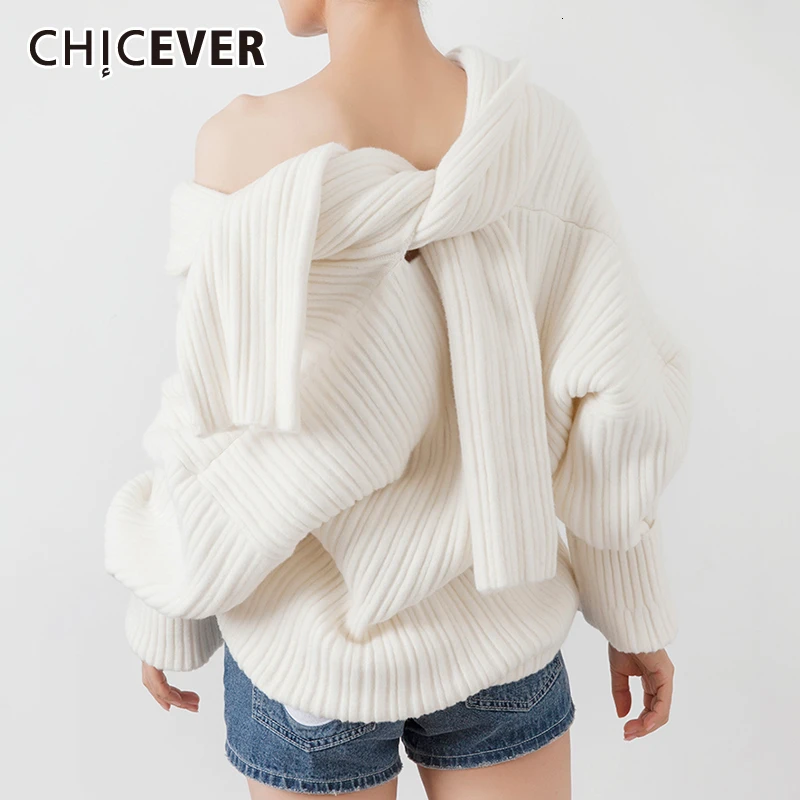 Best Price CHICEVER Korean Lace Up Knitting Women's Sweater Slash Collar Off Shoulder Long Sleeve Female Sweat