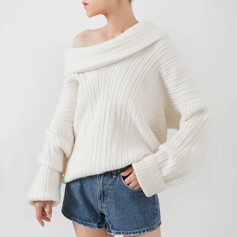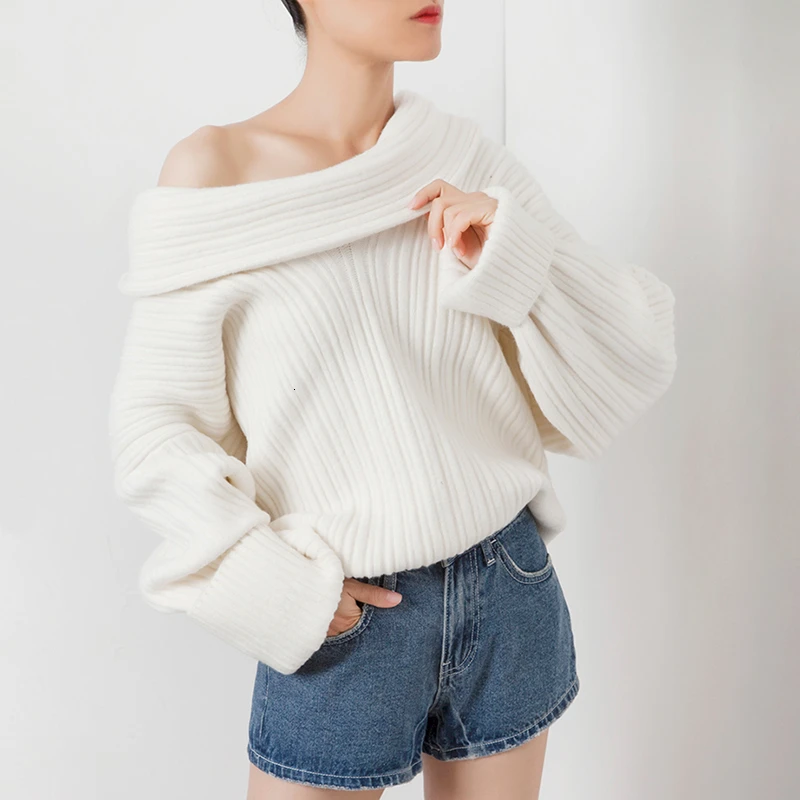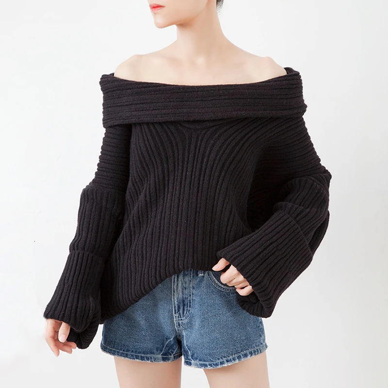 Discount CHICEVER Korean Lace Up Knitting Women's Sweater Slash Collar Off Shoulder Long Sleeve Female Sweat