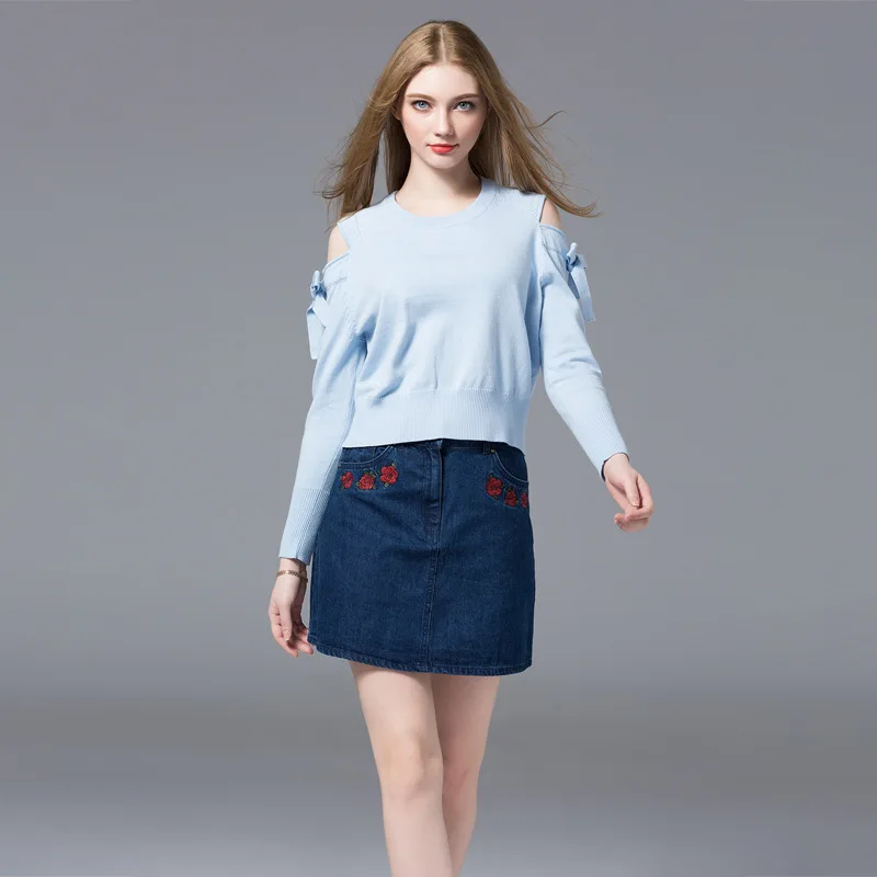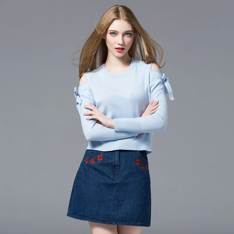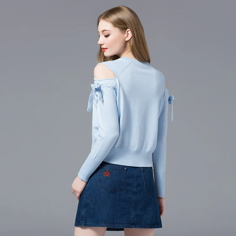 Big Discount 2018 Euro Style New Style Pure Color Bow-knot All Matched Jersey Round Neck Bare Shoulder Sleeve Wo